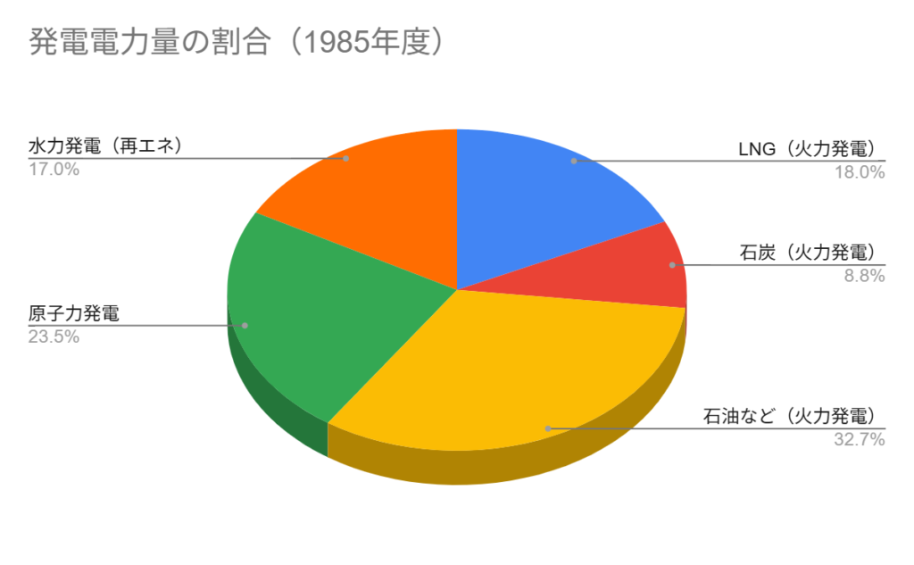 まずは、1985年に世界で環境汚染が注目され始めた直後の日本の発電方法と割合です。